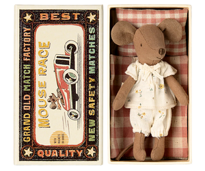 A classic Maileg item. This mouse is ready for hours of play and sleeps tight in the matchbox. The clothes and bed linen come in unique prints and beautiful colours. She makes a perfect gift for any little boy or girl for hours of stimulating, imaginative play.