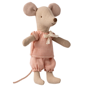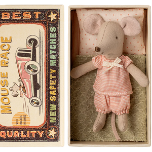 Aclassic Maileg little sister mouse in the matchbox. This mouse is ready for hours of play and sleeps tight in the little matchbox. The clothes and bed linen are made of soft fabrics with unique prints in beautiful colors, so she has plenty of energy for the next day, to dance and play! Part of the Maileg collection.