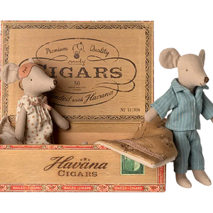 A classic Maileg item. Mum and Dad mice are wearing their beautiful nightwear and eye masks. The cigar box is a perfect bed for a good night’s sleep and sweet dreams. Perfect for imaginative play for your little ones.