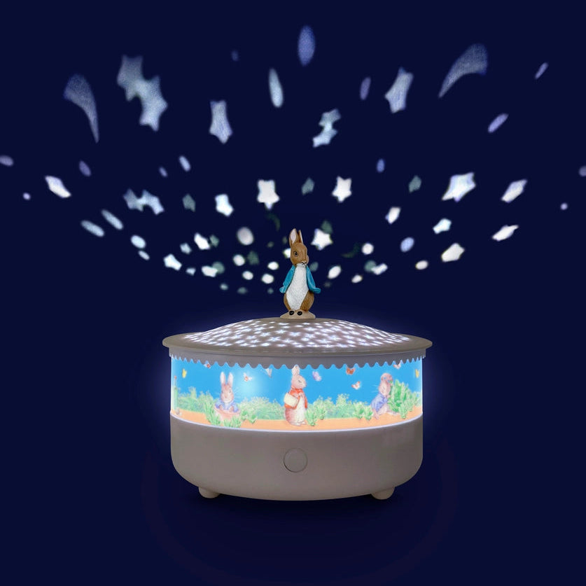 This beautifully crafted and illustrated Peter Rabbit night light is the perfect addition to your child’s bedtime routine. Not only does it project delicate white stars around the room, but it also plays a soothing lullaby to help little ones drift off to sleep.